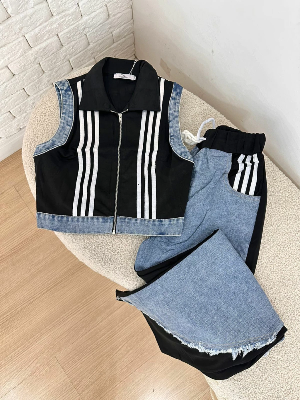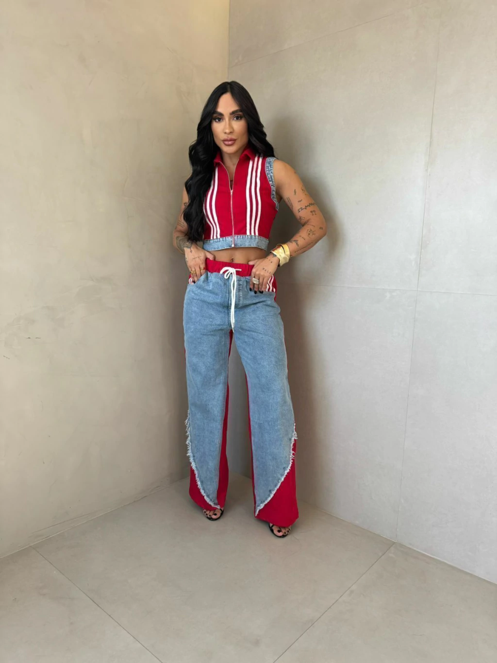 - CONJUNTO COM DETALHES EM JEANS, CROPPED SEM BOJO COM ZIPER FRONTAL, CALÇA COM ELASTICO NA CINTURA, BOLSOS LATERAIS E TRASEIROS.