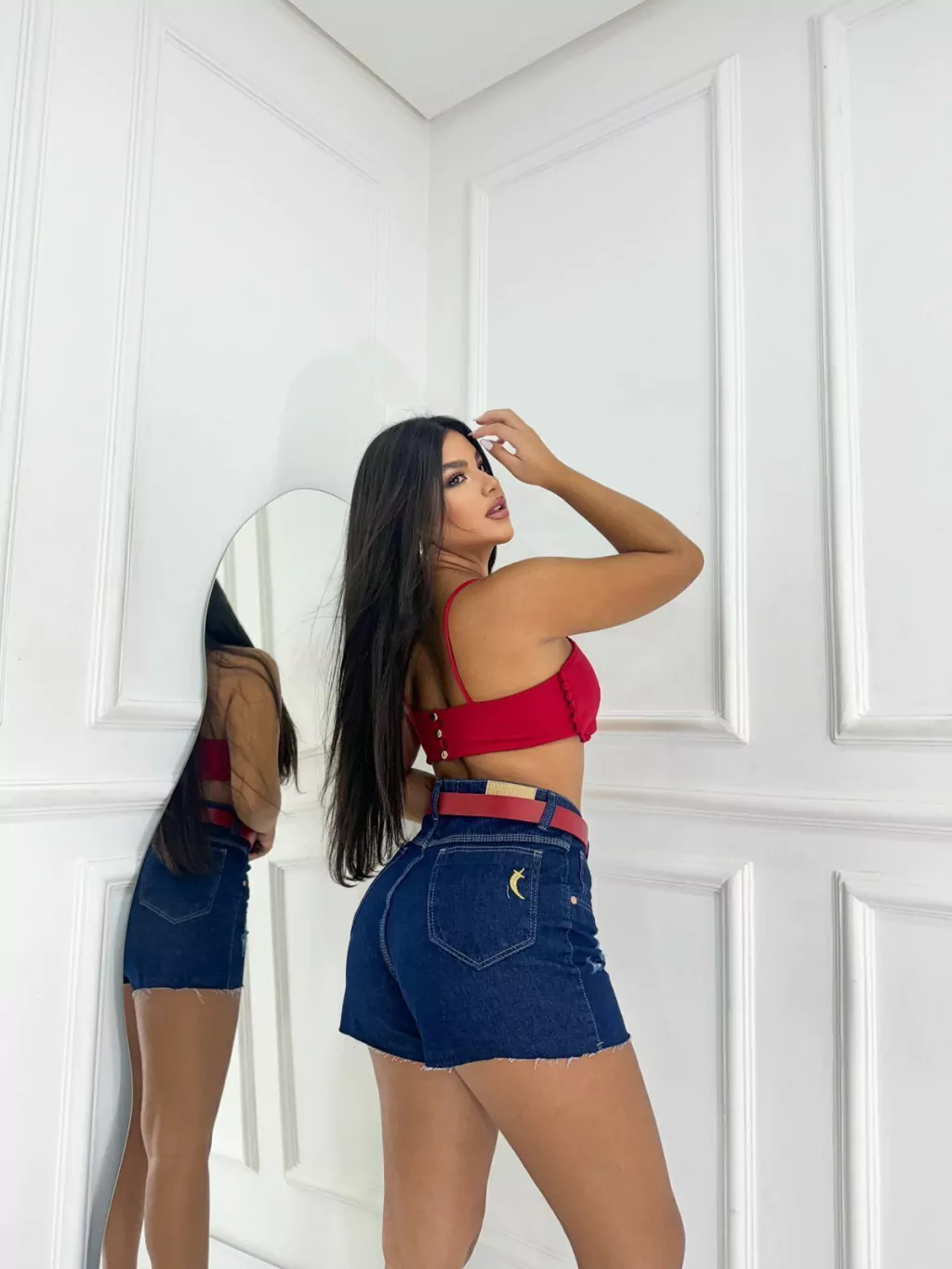 - SHORT JEANS SAL E PIMENTA, BOLSO FAKE FRONTAL E BOLSOS TRASEIROS.