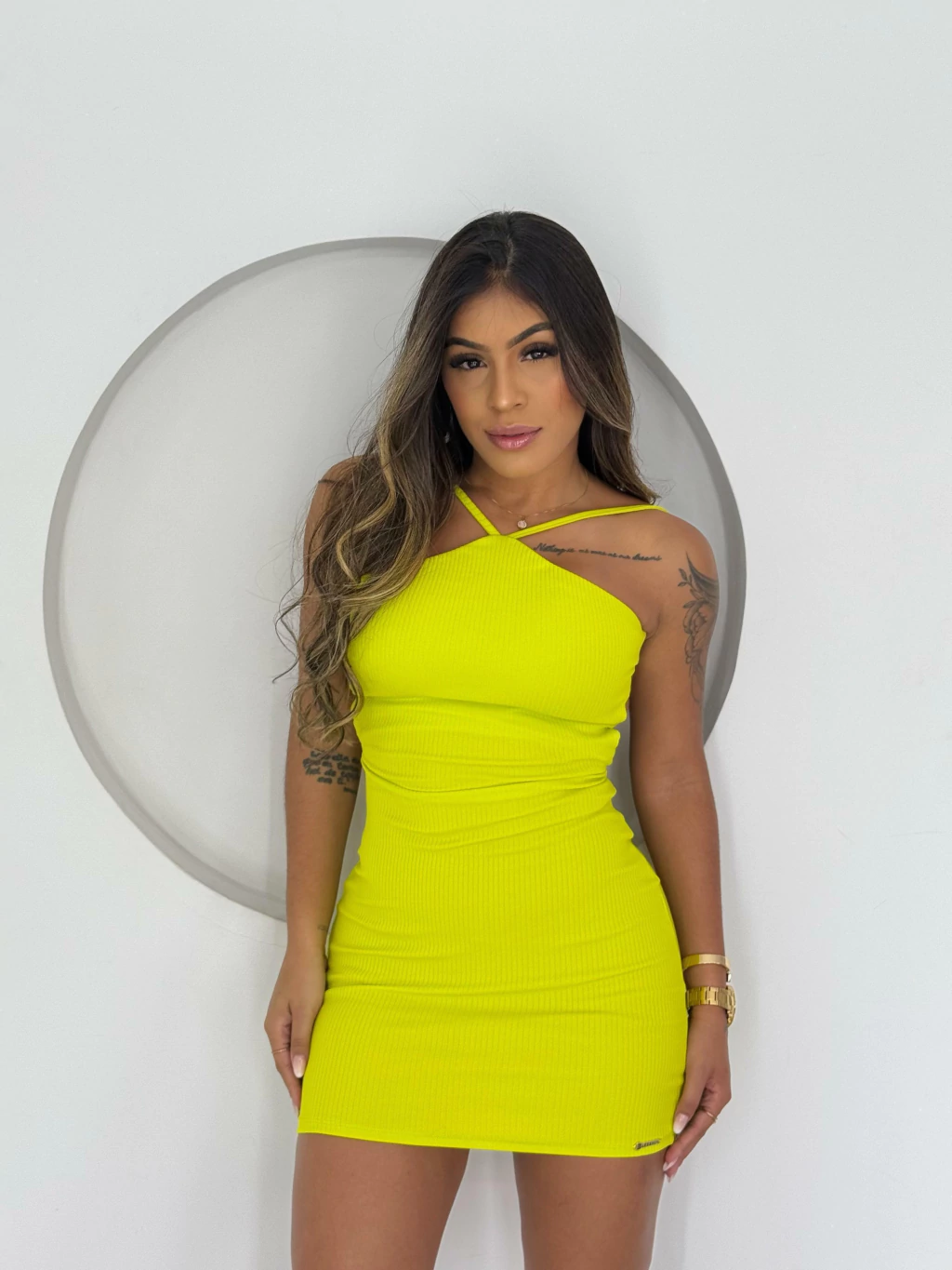 - VESTIDO EM TECIDO CANELADO POWER, SEM BOJO, POSSUI AMARRAÇÃO NAS COSTAS.